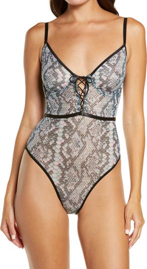 Put them under your spell in this sheer micro-mesh bodysuit styled with a hypnotic print, caged straps and a plunging lace-up neckline.