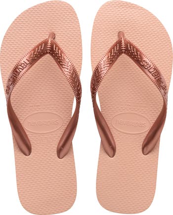 Slim, metallic straps catch the sun atop a flip-flop crafted for warm-weather comfort from cushy rubber.