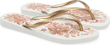 A classic flip-flop features a pearlized slim strap and floral-patterned footbed inspired by the peony, a bloom native to Bhutan.
