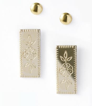 Discover effortless elegance with our Haveli Etched Earring Set. This delightful set features a classic round gold stud and a sleek silver rectangular stud adorned with an intricate floral embossed design.
