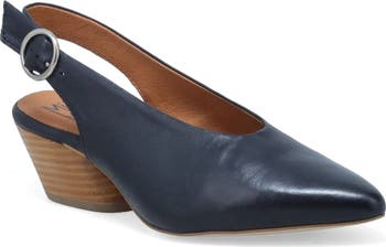 A high-cut topline and pointy toe bring subtle dimension to a slingback leather pump grounded by a cushioned footbed and sculptural, stacked heel.