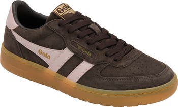 Golden-foil logo accents stand out against the velvety suede of this water-repellent sneaker set on a grippy rubber bumper sole.