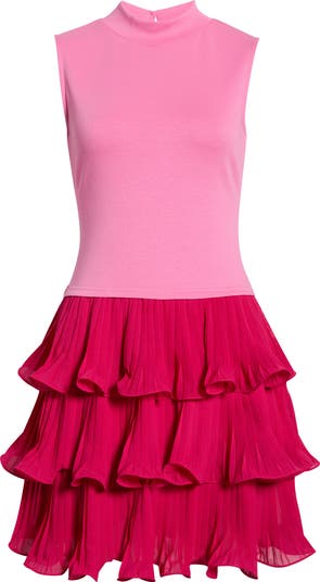 A knit, sleeveless bodice leads to a pleated and tiered woven skirt on this playful colorblocked minidress that flutters with every step you take