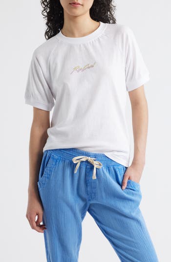 Abbreviated raglan sleeves add structure to this soft linen-kissed T-shirt stamped with a sporty logo print.