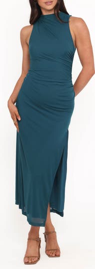 A soaring side slit puts a leggy finish on this cowl-neck dress ruched for extra texture.