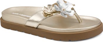 Metallic floral appliqués bloom at the straps of a warm-weather ready flip-flop set on a cushy, contoured footbed for comfort.