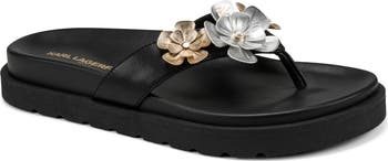 Metallic floral appliqués and logo details shine at the straps of a warm-weather ready flip-flop set on a cushy, contoured footbed for comfort.