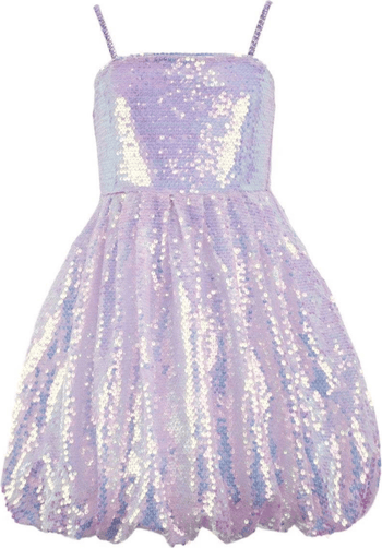 Eye-catching iridescent sequin fabric that shimmers with every move. Unique bubble skirt design for a playful and stylish silhouette. Delicate spaghetti straps with subtle embellishments for added elegance.