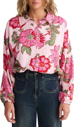 Transition easily from work to play in this blousy linen-kissed shirt romanced by vivid sketched blooms.