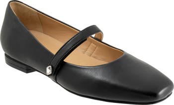 A square toe and streamlined profile distinguish a smooth leather flat featuring premium underfoot cushioning and an adjustable mary jane strap for comfortable wear.