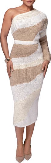 A warm woolly sweater is made in a shoulder-showing silhouette and accented in wide neutral stripes.