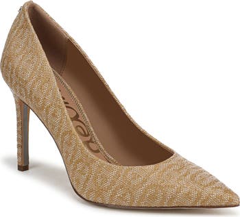 Woven raffia adds subtle texture to a minimalist pointy-toe pump set on a sleek heel.