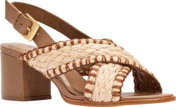 Stroll from boardwalk shopping to waterfront dining in this soft leather slingback sandal fashioned with whipstitched raffia straps and a wrapped block heel.