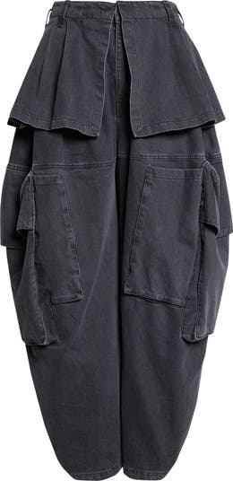 Hillary Taymour remixes utilitarian workwear with schoolcore charm in these dramatically oversized denim cargo pants flounced with a miniskirt overlay.