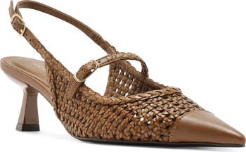 Woven composition enhances the contemporary allure of this pointy-toe pump complete with a graceful slingback strap.