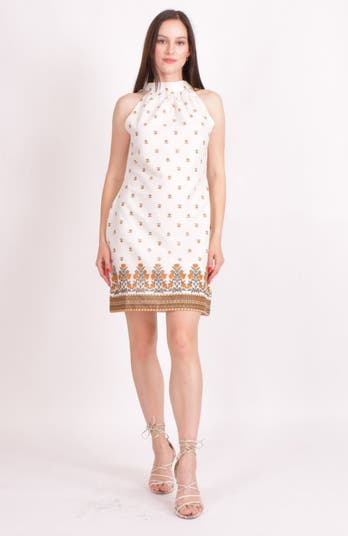 The Hazie Cotton Mini Dress is a light and playful white tunic-style silhouette crafted from soft mul cotton. Printed floral patterns along the hem bring a feminine touch without taking away from the clean, minimal look. Whether you style it casually with flats or dress it up with accessories, this halter cotton mini dress fits effortlessly into sunny-day plans.
