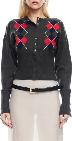 Extended ribbing at the hems and cuffs shape this soft and simply chic argyle cardigan secured by tonal snaps at the front.