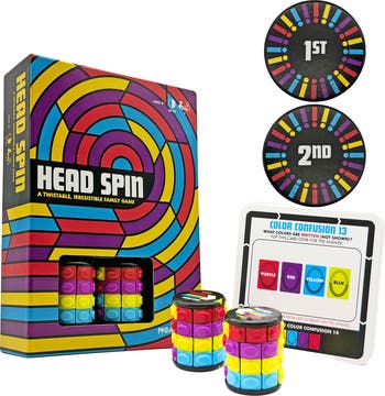 Get ready for fast-paced, fidget-filled fun with Head Spin! In this thrilling game, quick fingers and sharp minds race to solve color-coded logic puzzles. Each round, players use the fidget spinner to align their answer based on the prompt card, then slam it down on the landing pad. The first correct answer wins the round! With easy-to-learn rules, 20-30 minute gameplay, and all players engaged at once, Head Spin keeps the energy high and the fun nonstop. Perfect for family game night or gatherings with friends, this game is a fantastic way to combine speed, strategy, and fun!