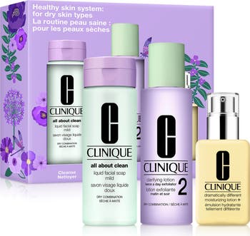 How to use: Use All About Clean Liquid Facial Soap twice a day, morning and night. Lather between palms with lukewarm water. Massage over makeup-free face and neck. Rinse thoroughly; pat skin dry. Use Clarifying Lotion 2 twice a day, morning and night. Apply with a cotton ball, sweeping gently over face and neck. For external use only. Avoid eye area and lips. Spread Dramatically Different Moisturizing Lotion+ all over face and throat twice daily, or where needed.