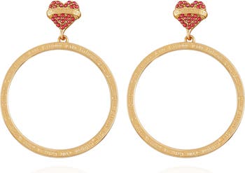Fall in love with bold style. These True Religion statement earrings combine a sparkling pink heart post with an oversized gold-tone frtonal hoop engraved with the iconic logo. Glamorous and playful, they're made to turn heads and steal hearts - perfect for making every moment unforgettable.