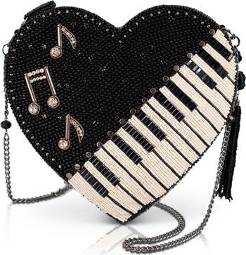 Hit all the right notes with this music-loving crossbody! Heart-shaped and decked out in dazzling beads, it features a chic piano keyboard and floating musical notes that come alive with every step. Perfect for performers, dreamers, and anyone whose heart beats to its own rhythm, this bag brings harmony, sparkle, and style together in one standout accessory.