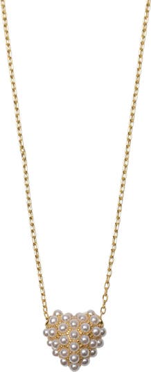 Faux pearls illuminate the heart-shaped pendant of this sterling silver necklace plated in gleaming 18-karat gold.