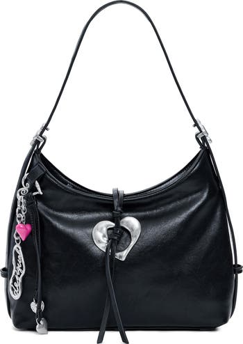 This '90s-inspired shoulder bag is made from shiny faux leather and fashioned with silvery heart and logo charms for an added whimsical touch.