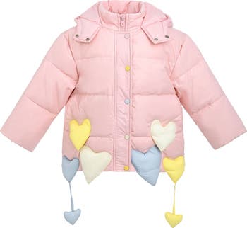 Bundle up in charm with this puffer jacket, designed to delight. Featuring a cozy hood and playful multicolored snap buttons, it’s the six dangling pastel heart charms that steal the show—adding a touch of magic to every twirl and tumble. Perfect for chilly days with a sprinkle of imagination.