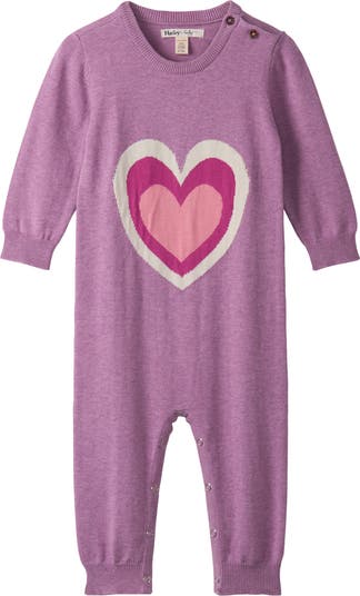 Intarsia hearts center a supersoft cotton sweater-romper that your sweet little Valentine will love crawling around in.