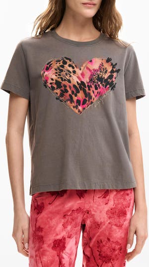 A vibrant animal-spotted heart is outlined in stitching on this garment-washed cotton T-shirt.