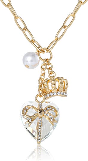 Heart, Crown, Pearl Charm Cluster Necklace, Gold-Tone