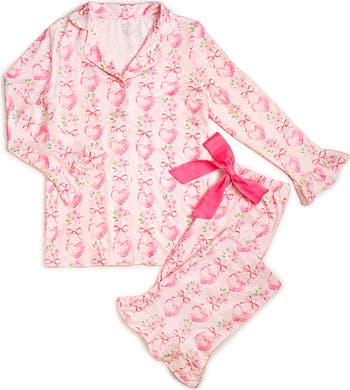 This cozy pink heart-print lounge set with ruffle trim and a satin bow is perfect for relaxing in style. Pair it with the matching kids’ version for a sweet “Mama and Me” look that’s as comfy as it is cute.