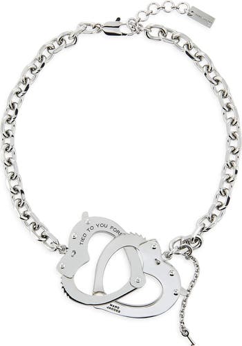 This chain-link necklace featuring heart-shaped handcuffs is perfect for adding a little spice to your accessory game.