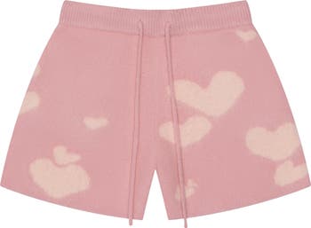 A jacquard of hearts brings charm to lightweight and fuzzy sweater-shorts topped with a drawstring waist.
