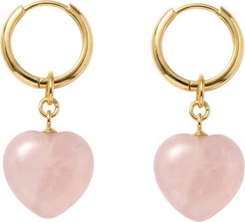 A pair of plump heart-shaped charm earrings in pink quartzite with 14k gold-plated huggie hoops. Natural quartzite made by handwork of carving and polishing. Because of the gemstone’s natural characteristics, each piece may vary slightly in colors and textures.