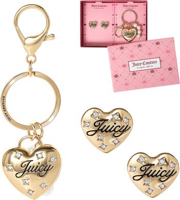 Show off your love for glam with this Juicy Couture heart keychain and earring set. Featuring luxe gold-tone metal and sparkling crystal details, both pieces are styled with raised heart shapes and “Juicy” script for a bold, signature look. Whether for yourself or as a gift, this matching set adds the perfect pop of playful charm.