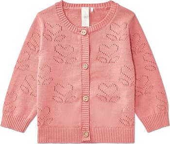Love today's vintage trend? You'll appreciate this charming cardigan for baby and toddler girls. It comes in 100% fine-gauge cotton for ultimate silky softness. It boasts chunky rib trim and coconut buttons for old-school cozy comfort. Plus, it features our open-work heart design for the perfect feminine finish.