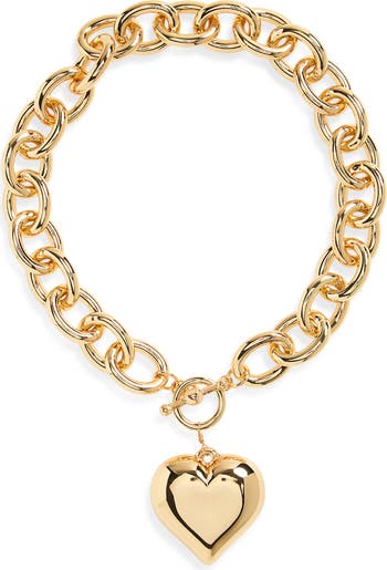 Show off romantic shine with this bold collar necklace composed of gleaming oval links suspending a puffy heart pendant.