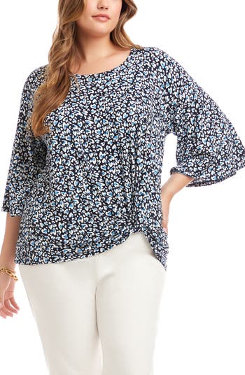 Season-spanning three-quarter-length sleeves in a flared design frame a stretch-kissed jersey top that's decked in dancing hearts and finished with a cute twist at the hem.