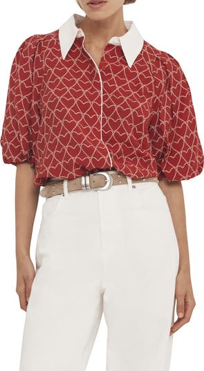 Red heart print shirt with a contrast classic collar, pleat detail shoulders, short puff sleeves, elasticated waistband with a concealed button fastening through the front.