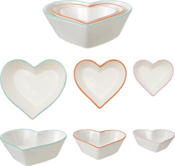 - A charming set of white stoneware bowls with heart shapes and colorful rims