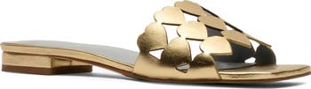 Heart-shaped cutouts punctuate a Brazilian-made slide sandal shaped from metallic leather and featuring a squared-off toe.