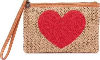 This grab-and-go straw pouch is perfect for cards and small essentials and fitted with a leather wristlet strap for convenient carrying.