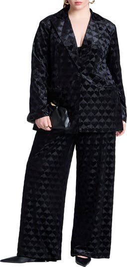 Velvet-burnout wide-leg trousers with a luxurious sheen and full 30.5" inseam.