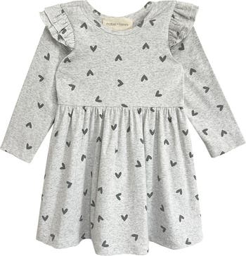 - Dress your little one in effortless style with the Heartfelt Dress by Mabel and Honey. This light gray dress features a playful dark gray heart pattern, adding a sweet, whimsical touch. With ruffled shoulder details, long sleeves, and a gathered waist, it combines elegance with comfort. Perfectly designed for versatile wear, its a delightful choice for your child?s everyday moments or memorable outings. Fabric Care Machine Wash Cold