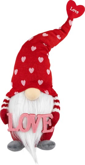 Spread Love this Valentine's Day season with our charming love gnome! Dressed in a stylish striped red and white suit, adorned with a red pointy gnome hat embellished with pink hearts, this adorable gnome is here to capture your heart. Gracing your home with love, the gnome holds a vibrant pink and red "LOVE" sign. Celebrate love, friendship, and the magic of this special day with this endearing Valentine's Day figure. Product Features: Valentine's Day love gnome Dressed in a striped red and white suit Hat decorated with pink hearts and a red "Love" heart atop Holding a pink and red "LOVE" sign Gnome has a long white beard and a bulbous nose Hat comes with a bendable wire center, allowing for easy positioning Weighted bottom for stability For indoor use only Dimensions: 18.5"H X 6"W X 5"D Material(s): fabric/plastic/faux fur