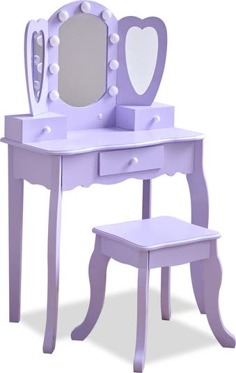 Includes: Table with an acrylic oval mirror surrounded by LED lights, a stool, a storage drawer and tabletop bins (AAA batteries not included)