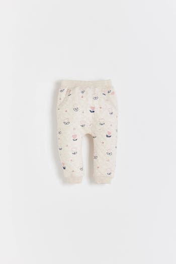 Printed matelasse pants with an elastic waistband and ribbed cuffs. The fabric provides comfort for everyday activities with freedom of movement.