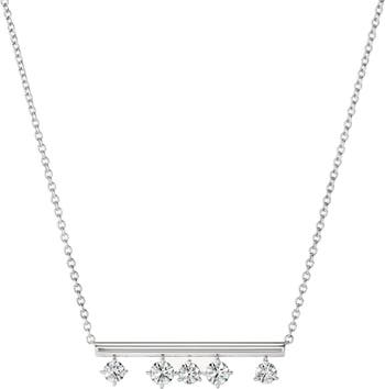 Floating diamonds catch light on the bar pendant of this 18-karat-gold necklace.