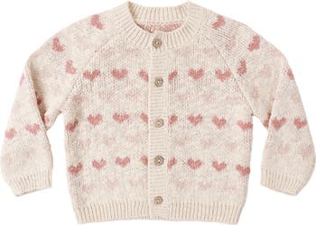 Pure organic cotton knit in a jacquard of pastel hearts makes this cardigan perfect for your cuddly little Valentine.